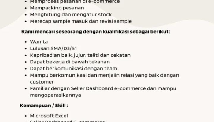 - Teknis: Familiar dan mampu mengoperasikan Seller Dashboard e-commerce.