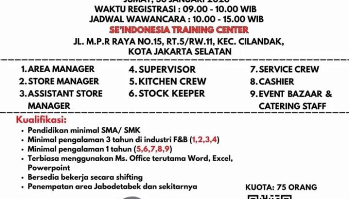 Siapkan CV terbaik Anda! SE’INDONESIA kembali membuka peluang karir besar-besaran bagi Anda yang ingin berkembang di industri Food & Beverage (F&B). Kali ini, SE’INDONESIA mengadakan Walk In Interview khusus area JABODETABEK untuk mencari talenta profesional yang siap memberikan pelayanan terbaik kepada pelanggan.