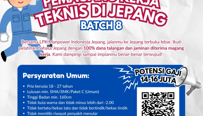 Mimpi bekerja di Jepang dengan gaji yang menarik kini semakin dekat! LPK Manpower Indonesia Jepang membuka kesempatan Open Recruitment Pemagang Kerja Teknis di Jepang Batch 8. Ini adalah jalur terbaik bagi Anda lulusan SMA/SMK yang ingin mendapatkan pengalaman kerja teknis berharga di luar negeri. Dapatkan fasilitas pelatihan bahasa 100% ditanggung dan jaminan pendampingan hingga impian Anda terwujud! Cari tahu persyaratan lengkap Loker Pemagangan Jepang 2025 ini sekarang!